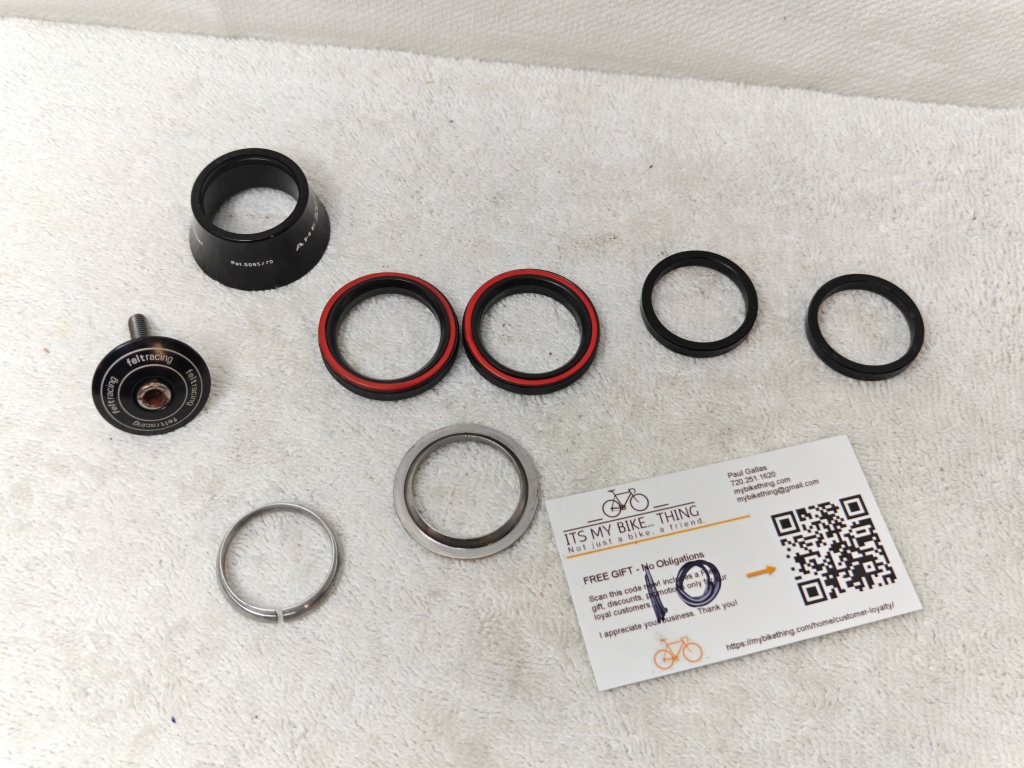 Notes from MyBikeThing: Complete headset with everything you need — crown race, bearings, spacers, seals, and bolt. The Aheadset is Cane Creek’s proven workhorse. Serviceable bearings mean you can regrease and keep rolling rather than replacing sealed cartridges.