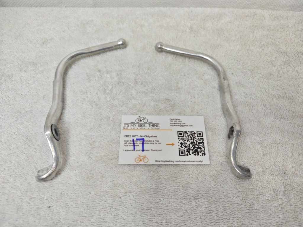 Keywords: Dia-Compe, safety levers, turkey levers, interrupter levers, vintage road bike, Japan, drop bar, Peugeot, Motobecan, French vintage, Eroica, brake lever arms, 1970s, 1980s, silver alloy, classic road bike