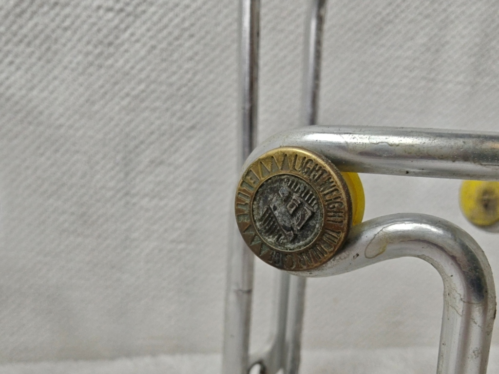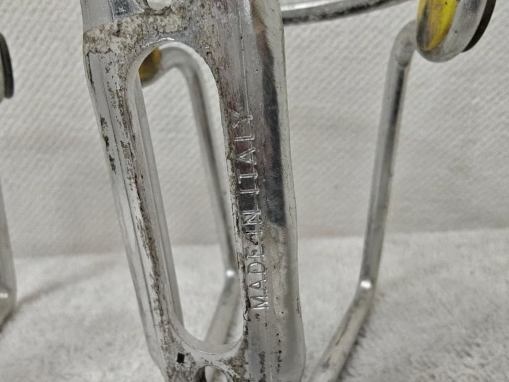 Notes from MyBikeThing: The alloy Ciussi Tubolare is the original — the cage that was spec’d on Italian race bikes through the 1970s and 80s before the stainless version arrived. The brass medallion, yellow buttons, and “Made in Italy” stamp on the mounting plate are exactly what the Eroica crowd and vintage restorers are hunting for. Period-correct on a Colnago, Bianchi, Pinarello, or any lugged Italian steel build from the era.