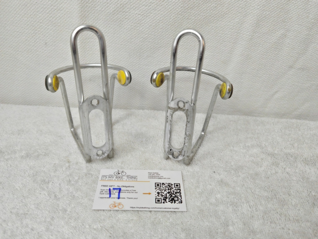 Keywords: Elite Ciussi, alloy, aluminum, tubolare, bottle cage, vintage, Italian, Made in Italy, Eroica, yellow buttons, brass badge, classic road bike, lugged steel, Colnago, Bianchi, Pinarello, vintage restoration, pair