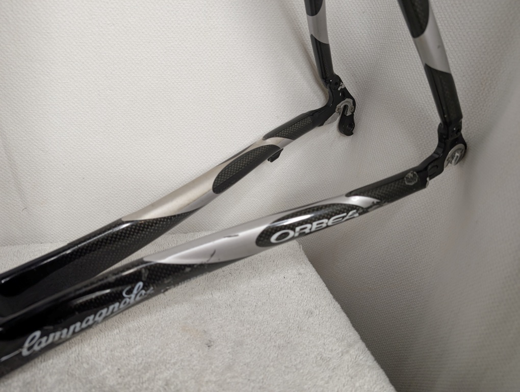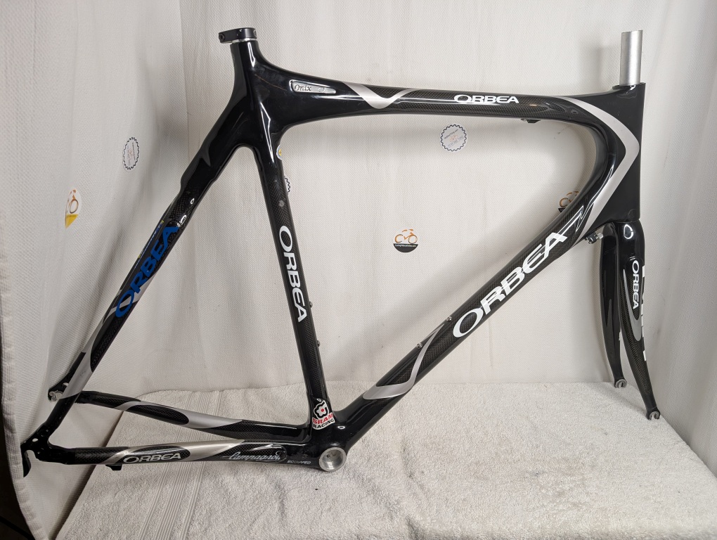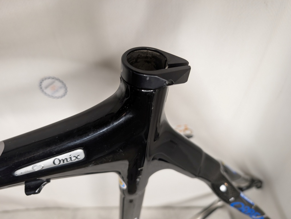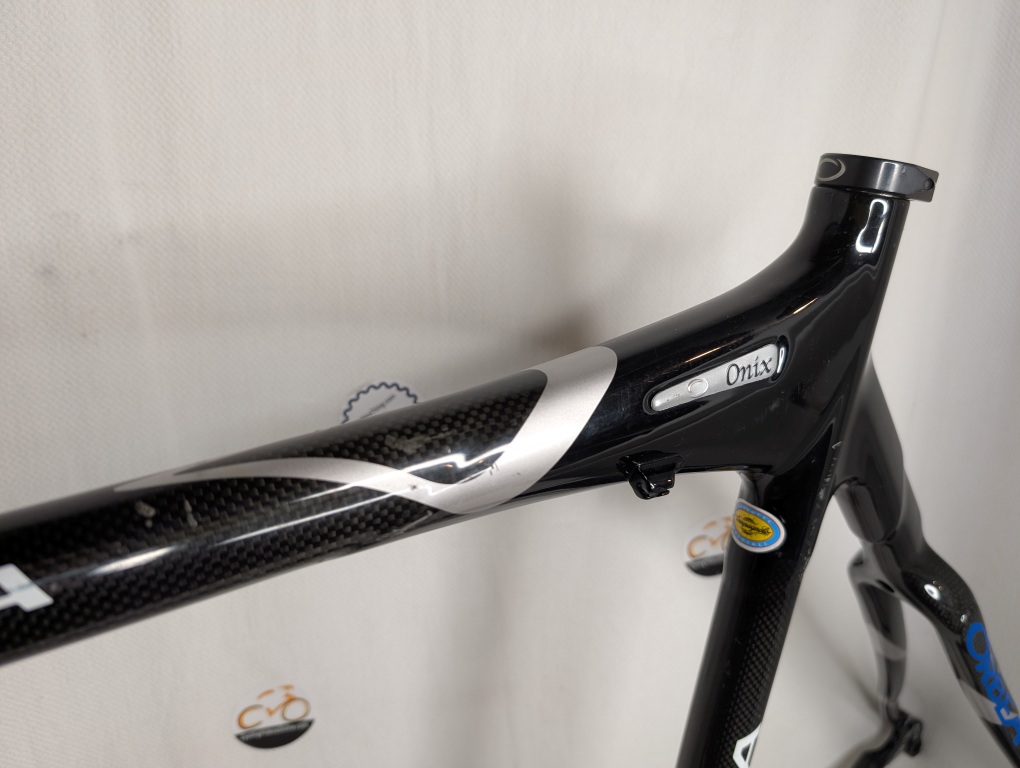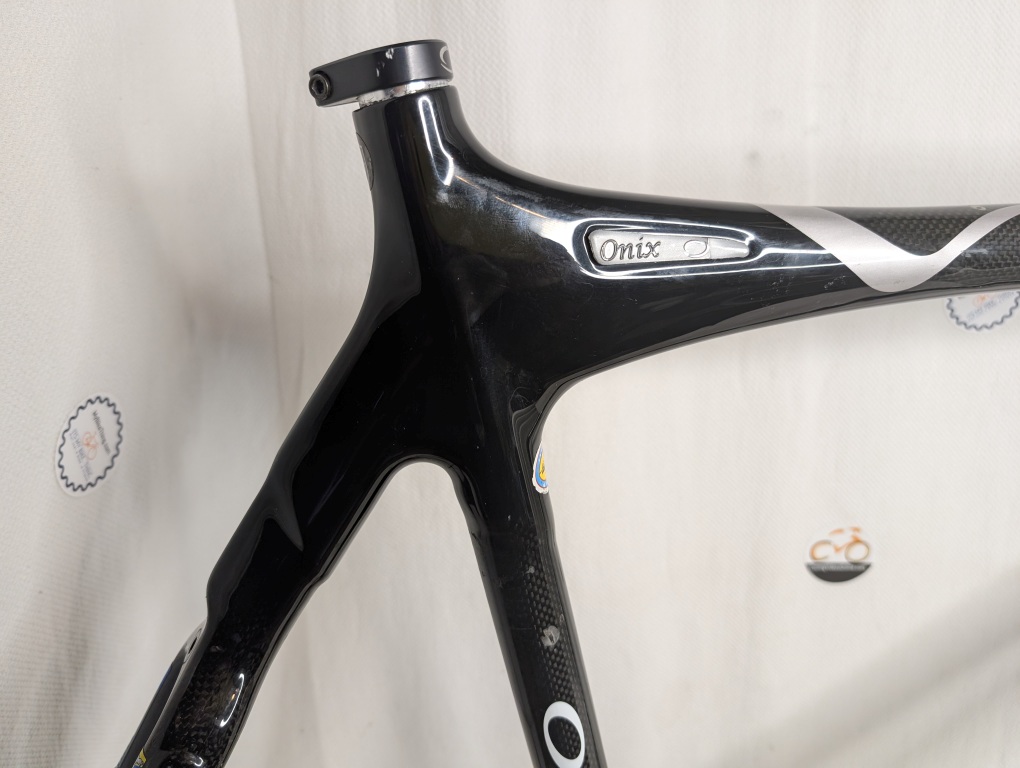 - The Onix represents Orbea’s mastery of aerodynamic carbon design – every tube shaped by wind tunnel data and racing heritage. This frame features distinctive wishbone flared seatstays and aerodynamic chainstays that slice through air while maintaining the structural integrity demanded by professional racing. The SRAM Racing and Campagnolo Equipped decals tell the story of a frame built for serious performance.