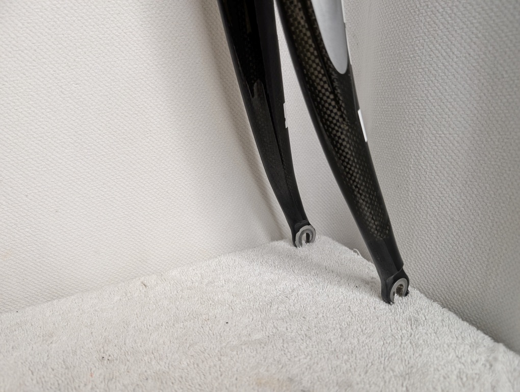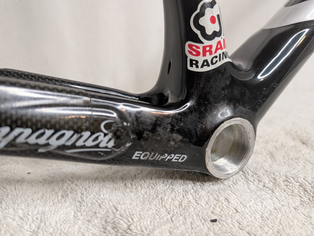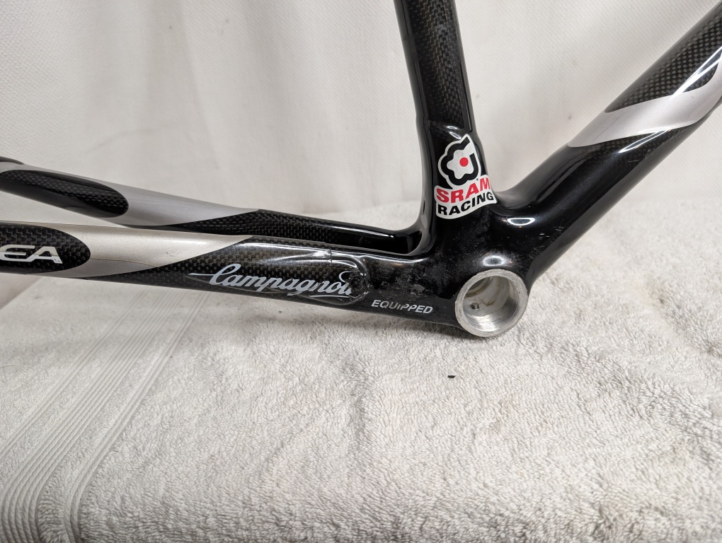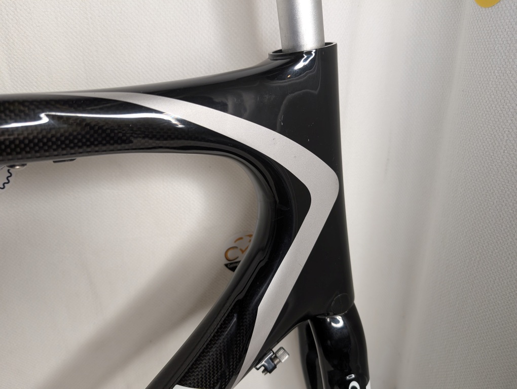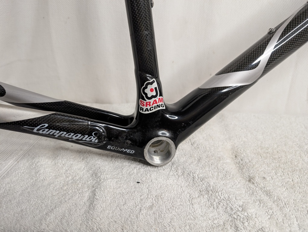 Very good condition with excellent labels and decals throughout. Light chip by bottom bracket on chainstay and very light scuffs and chips on seat tube and top tube. No structural damage or deep scratches. The carbon finish maintains its gloss and the frame shows typical careful use rather than hard racing wear.