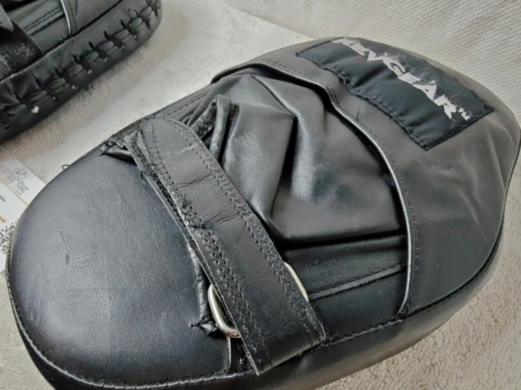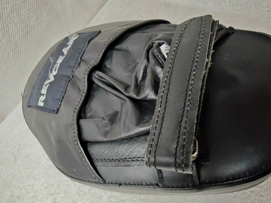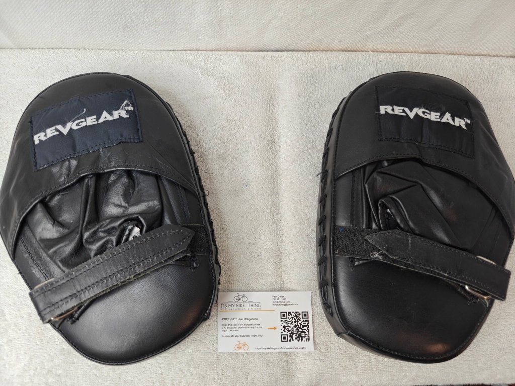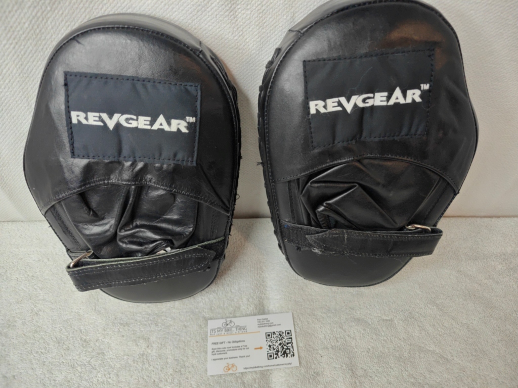Notes from MyBikeThing Revgear is a legit brand — used by coaches at serious gyms and backed by UFC-level fighters. The flat style is a traditional choice for coaches who prefer direct feedback over the cushioned catch of curved mitts. Getting these in like-new condition at a used price is a solid score.  Flat mitts demand better punch placement from the striker — no curved pocket to guide the fist in. That makes them a better teaching tool than curved mitts for developing accuracy. Standard in boxing gyms for good reason.
