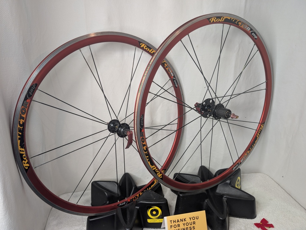 These iconic Rolf Vector Comp wheels are in excellent condition. Bearings spin smooth and true with no play, hubs are in great shape, and both wheels are perfectly trued and round. Brake surfaces show normal use with some residue (easily cleanable). Minor cosmetic scratches on rim sidewalls that don’t affect performance. These legendary wheels are ready to ride and deliver that distinctive Rolf performance.