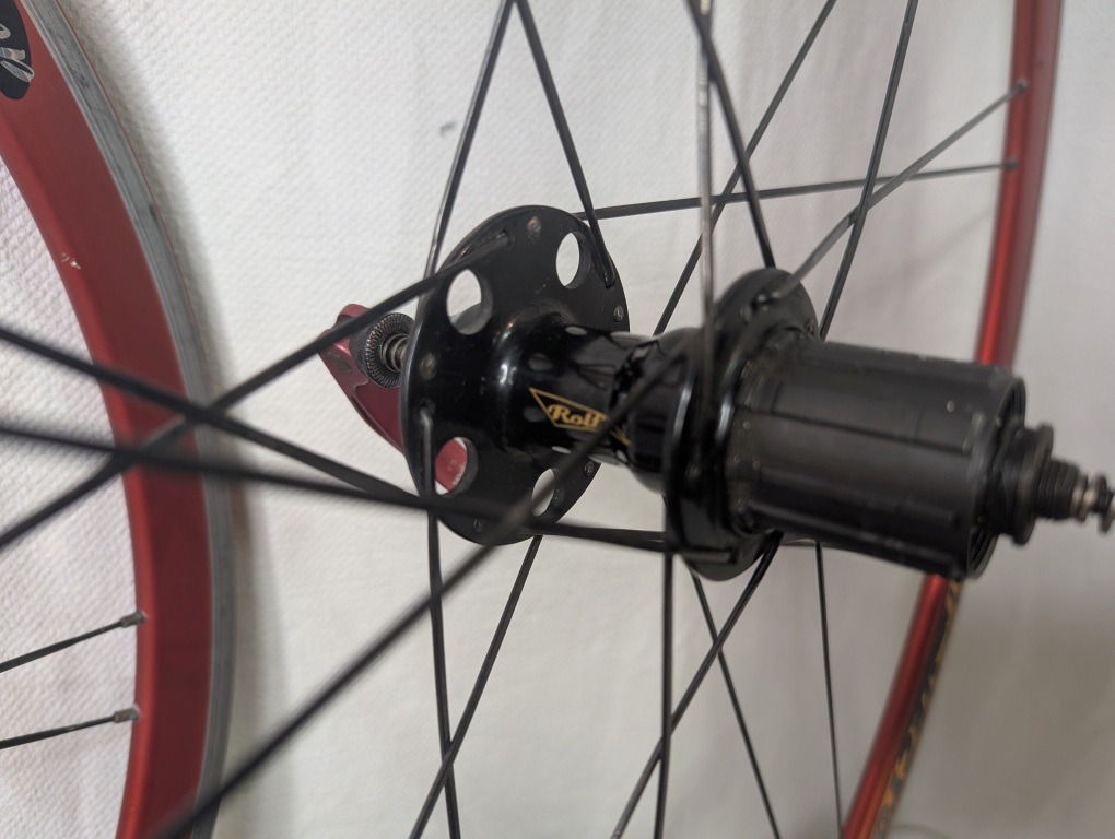 - Rear wheel: Rolf Vector Comp red anodized rim, Rolf hub with Shimano freehub, 20 bladed spokes