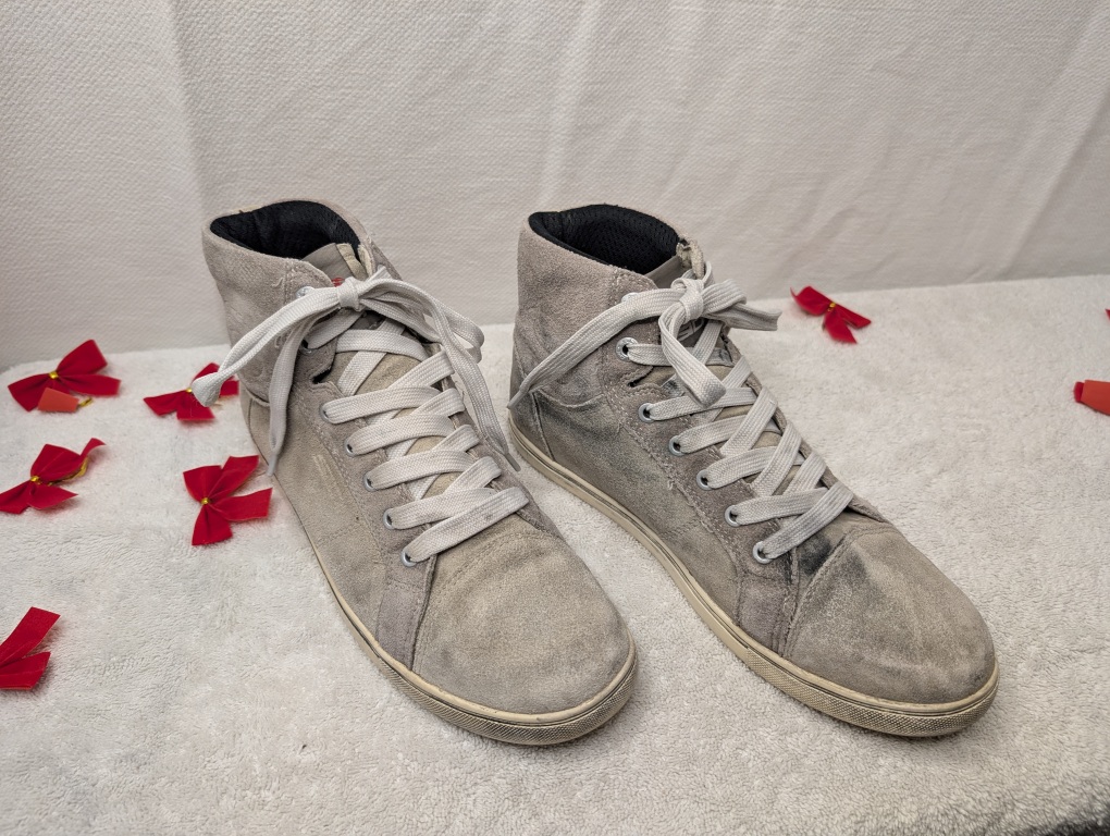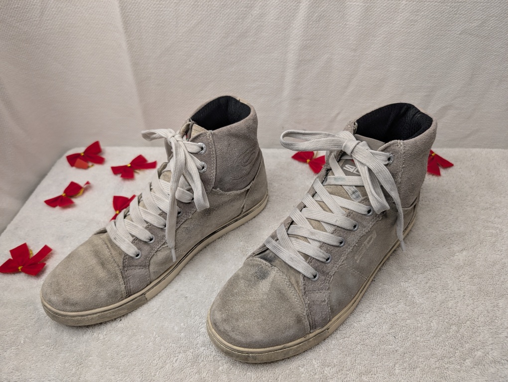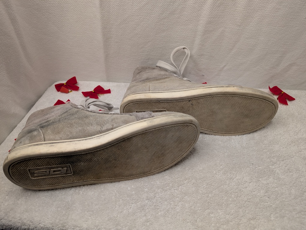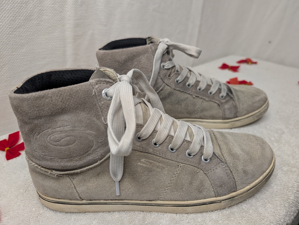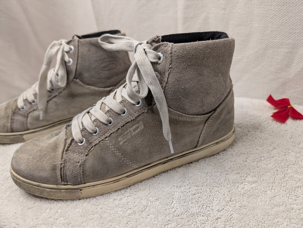 These Sidi casual motorcycle high-top sneakers combine the style of street shoes with real rider protection. Built with premium full-grain suede leather uppers and featuring Sidi’s signature ankle protection system, these boots are perfect for riders who want safety without the bulk of traditional motorcycle boots. The rubber soles provide excellent grip for both riding and walking, while the lace-up design ensures a secure, customizable fit. The visible shifter wear is a badge of honor showing these boots have protected a rider through real miles.