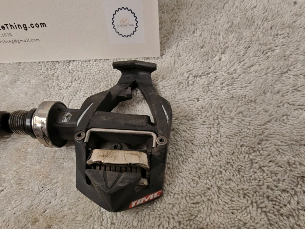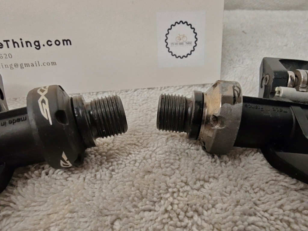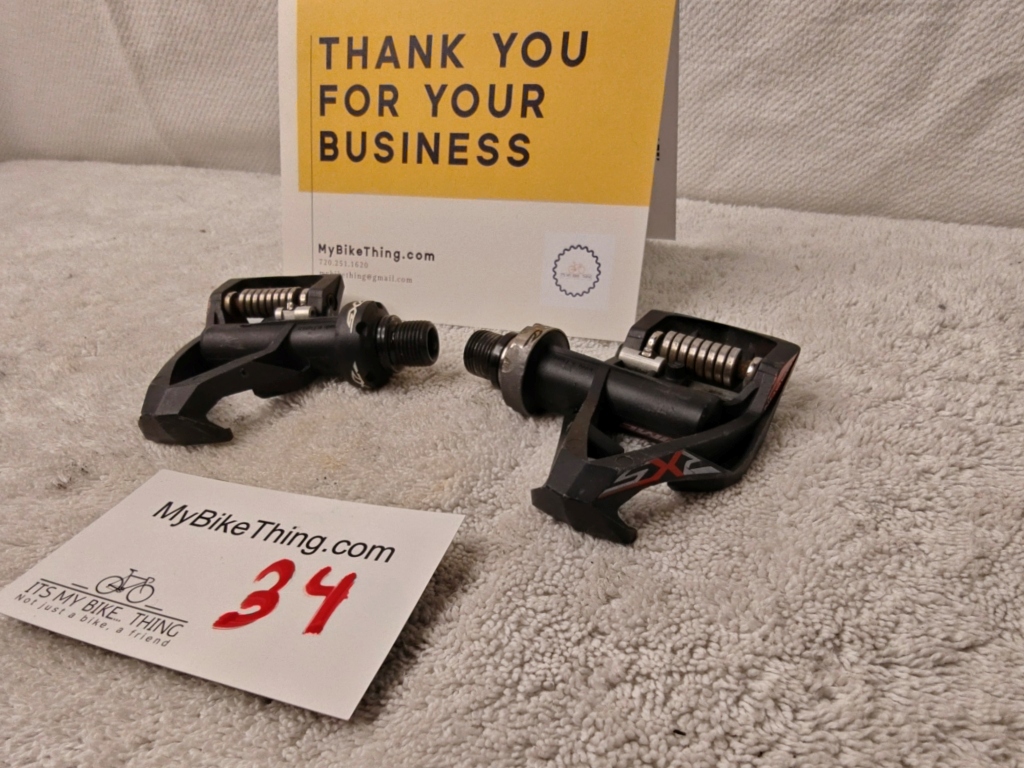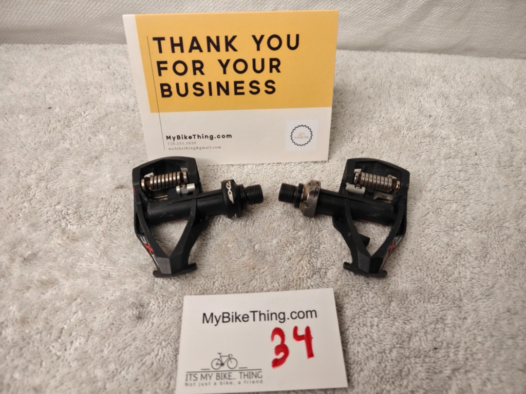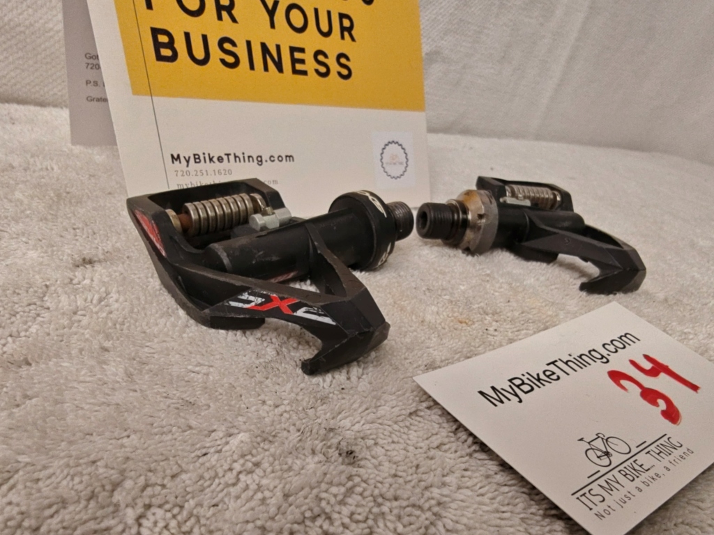 Condition: Pedal bodies show normal wear from use with some cosmetic marks. Spindles have surface patina but threads are clean. Bearings spin smoothly with no play, clip-in mechanism engages solidly on both pedals, spring tension adjustment works properly, cleat retention is excellent. Functionally these are ready to ride.