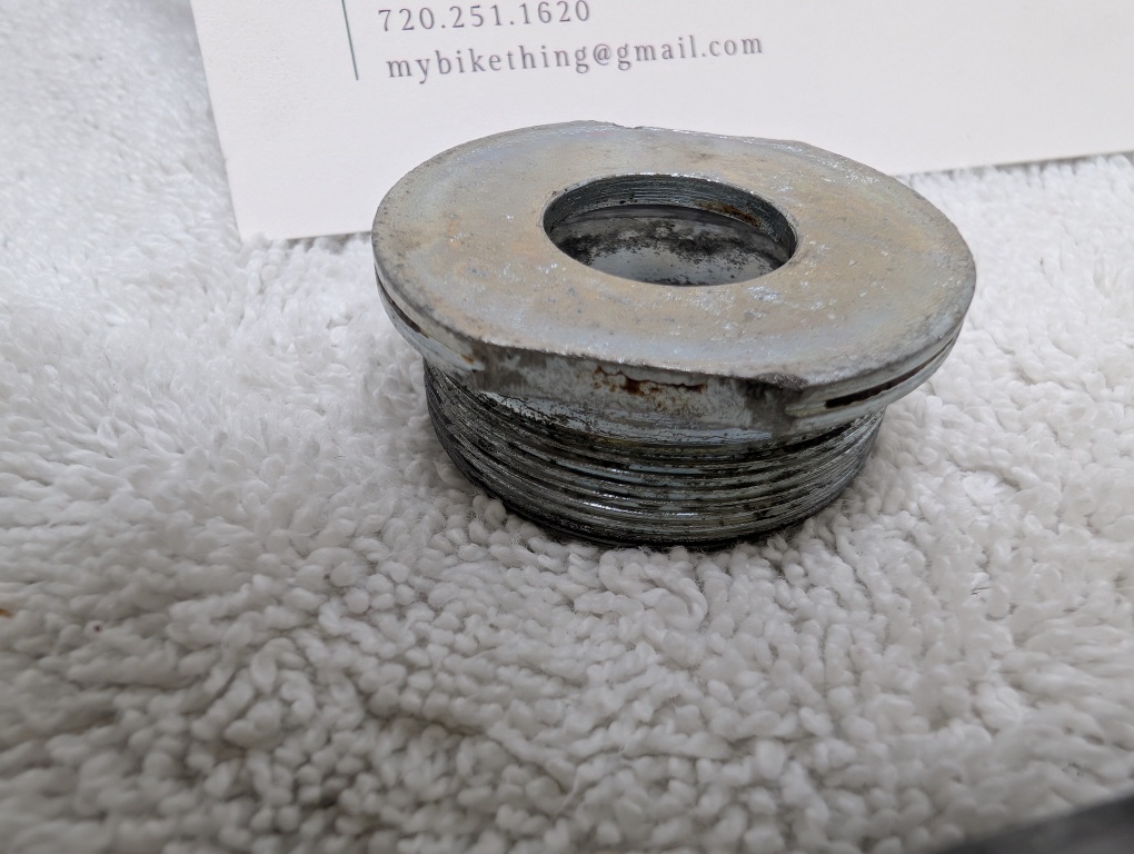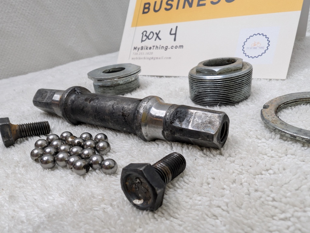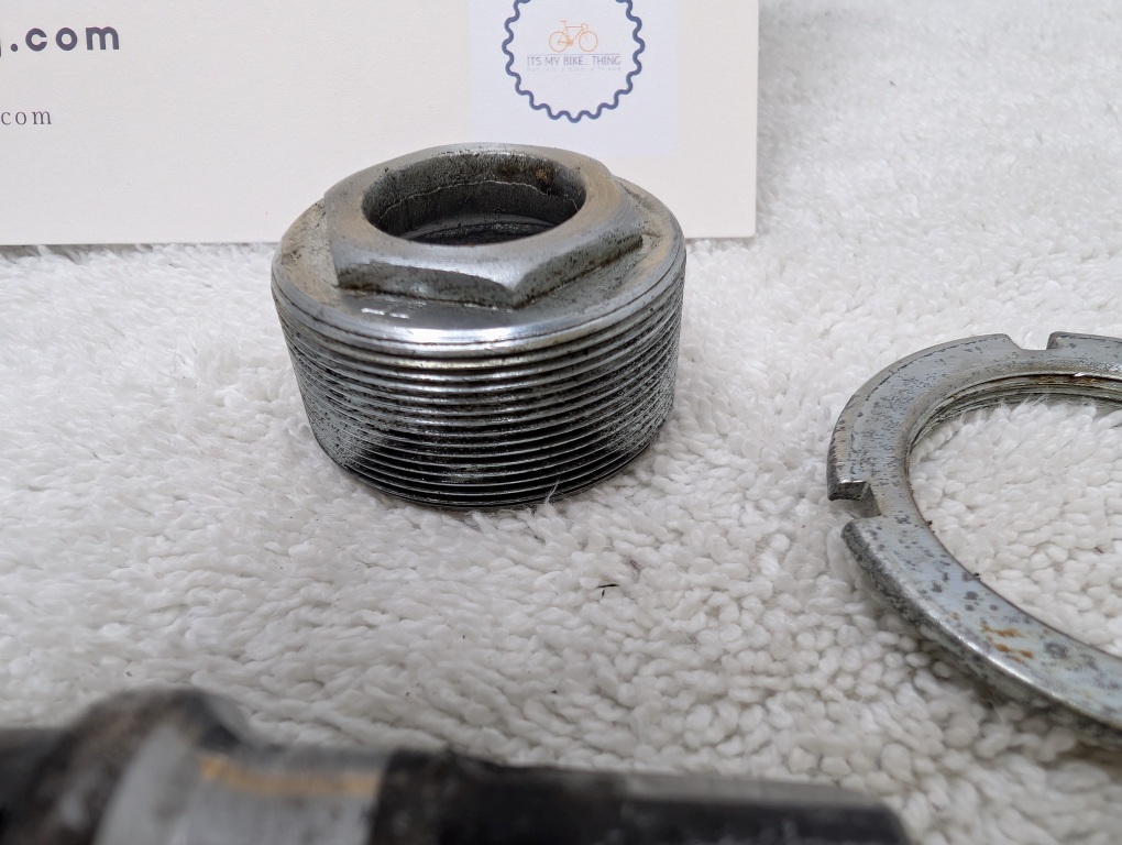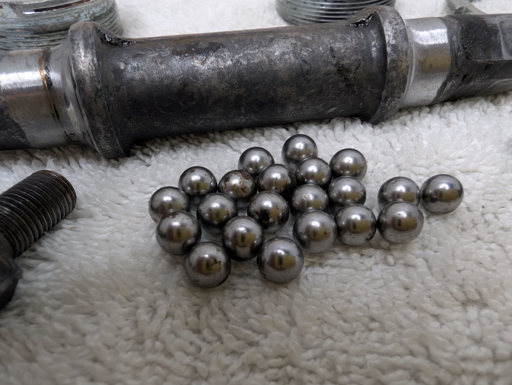 Condition: Good with honest age. Chrome shows patina but no rust or pitting. Threads are clean and sharp. Bearing races are smooth with no scoring. May be missing one bearing (21 counted, typically 11 per side). All other hardware included.